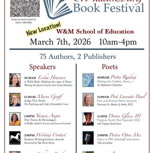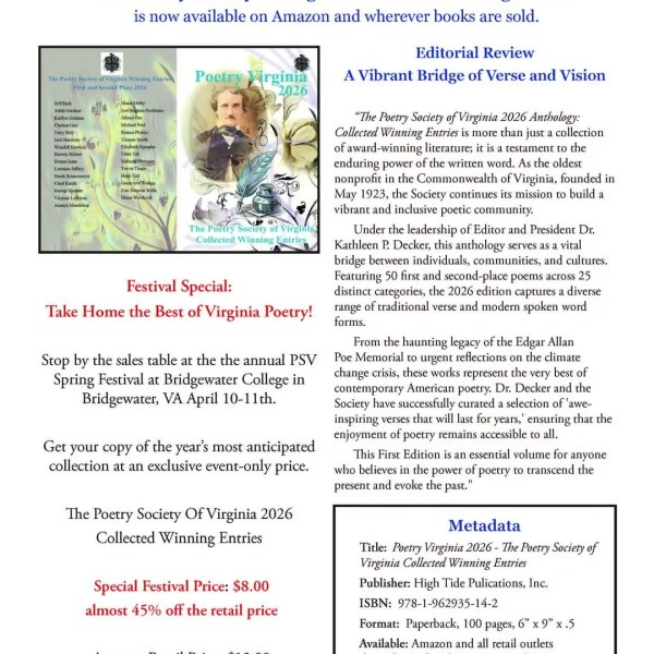 We illuminate Virginia’s poets, cultures, communities, and literary power by making and sharing poems. We are committed to fostering an inclusive community aimed at creating a sense of belonging in Virginia’s poetry community. We are committed to equity and the mutual respect for the diverse beliefs and values of all.…Continue reading “About the Poetry Society of Virginia”