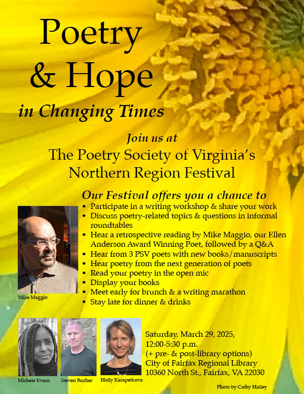 Join us at the PSV Northern Region Festival on March 29th from 12:00-5:30 PM at the City of Fairfax Regional Library. Events to include writing workshops, poetry readings, open mic, and fellowship with amazing Northern Region poets!